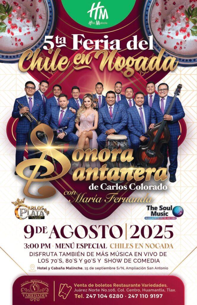 La feria también es un festín para el paladar. El 9 de agosto, la Feria del Chile en Nogada trae el sabor más emblemático de la temporada, acompañado de la música de la Sonora Santanera de Carlos Colorado con María Fernanda.