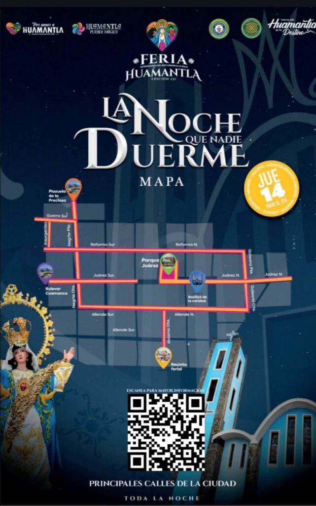 La cita más esperada llega el 14 de agosto con La Noche que Nadie Duerme, un evento que combina fe, arte y comunidad. Más de 7 kilómetros de alfombras multicolores hechas con aserrín, flores y semillas adornan las calles por donde pasa la procesión nocturna en honor a la Virgen de la Caridad. Esta tradición, que inicia la madrugada del 15 de agosto, es Patrimonio Cultural Inmaterial y uno de los mayores orgullos de Huamantla.